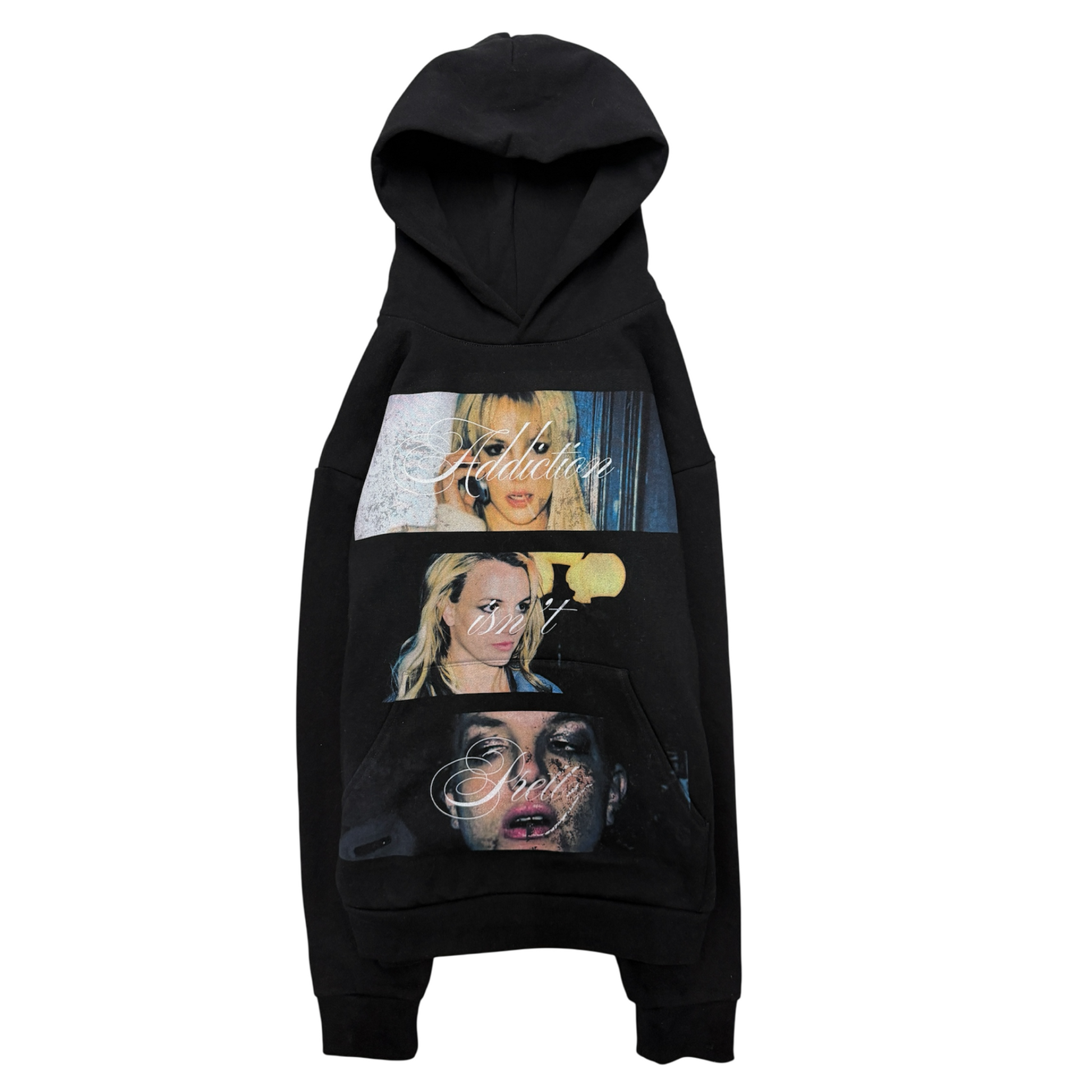 V2 of lindsay hoodie. Inspired by an icon’s dark past. Three Panels show Britney before, during, and at the peak of her addiction, showing over time that even the most beautiful people’s shine begins to fade to this disease.